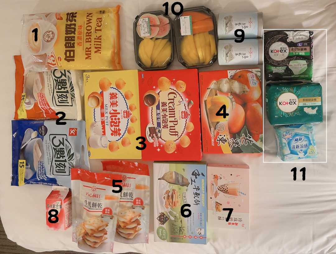 패키지 여행으로 간 여행이었지만 일정을 마친 저녁 여유시간을 내어 개인쇼핑을 하였다. I. 까르푸 꾸이린점(계림점) 대만 까르푸 꾸이린점에서 구매한 쇼핑 품목 [선택 이유] -한국인이 많이 가는 곳이라 하여, 문제가 생겨도 다른곳보다 소통이 쉬울 듯하여 선택. -카드 결제 가능하다는 점도 선택의 이유가 되었음 -다른 블로그들을 보니 꼭 꾸이린점이 아니더라도 24시간 하는 까르푸를 찾아 가면 개인 쇼핑은 충분할 것이라고 함. 24시간하는 곳은 규모가 크다고 함. [특이사항] 유명베이커리의 제품은 요즘에는 들어오지않는 것 같다(펑리수, 누가크래커 등) 2층에 ‘꼭 사야할 것’ 코너가 있으니 바쁘면 여기서 사가면 된다. 3층에 천인명차 코너가 따로 마련되어 있었다. [쇼핑항목] 컷팅과일(망고, 애플망고, 구아바), 천인명차 틴캔, 미스터브라운 밀크티, 3시15분밀크티 2종(오리지널, 얼그레이), 퍼프과자(우유, 초코), 망고젤리(유키스러브), 타피오카쿠키, 누가크래커 2종, 우유곽에 든 홍차 밀크티, 오이생리대(중형), KOTEX 생리대(대형, 팬티형) [쇼핑항목세부사항] 1. 미스터브라운 밀크티 파우더 밀크티. 물에 타먹는다. 중간크기 머그컵에 물 2/3를 담고 한 포를 넣어 마시면 너무 진하지않고 맛있었다. 맛있어서 계속 먹는 중. 먹다보니 (불피울 때 쓰는) 향의 향도 느껴진다. 2. 3시15분 밀크티(오리지널, 얼그레이) 한국에서도 유명하다. 평소 가향없는 밀크티를 좋아하는 사람은 오리지널, 얼그레이밀크티를 좋아하는 사람이면 얼그레이를 좋아할 것 같다. 3. 크림퍼프 과자(우유, 초코) 홈런볼의 바삭한 버전. 알맹이크기는 조금 더 작은 것 같고 겉 비스킷은 조금 더 두꺼워서 바삭한 질감인 것 같다. 단 정도는 홈런볼과 유사하다. 4. 유키스러브 망고젤리 망고젤리 중에서는 유키스러브가 유명하다고 한다. 차갑게 해서 먹으면 더 맛있을 것 같다. 물이 많으니 흐르지않게 조심할 것. 5. 누가크래커(추천코너) 누가가 단단한데, 전자레인지에 5~10초 돌려먹으면 적당히 녹아서 참 맛있다. 한국 코스트코에도 포장은 다른데 같은 제품이 있다는 얘기가 있다. 6. 누가비스킷 (5)번 누가크래커보다 누가가 덜 딱딱하다. 7. 타피오카쿠키 추천코너에 있어서 궁금해서 사봤다. 펑리수와 비슷하게 생겼고 안에 타피오카가 들어있는 모습이었다. 갸우뚱한 느낌이었다. 8. 우유곽에 든 홍차 밀크티(유니프레지던트) 궁금해서 구매. 종류도 다양하고 브랜드도 인지도가 있는 곳인 것 같아서 구매. 평범한 맛있는 홍차 밀크티맛. 잘 먹었다. 9. 천인명차 틴캔 천인명차는 워낙 유명해서 샀다. 아직 맛은 안 봤다. 10. 컷팅과일(망고, 애플망고, 구아바) 망고는 정말 달았다. 같이 산 웬만한 간식보다 달아서 맛있었다. 애플망고는 아무맛도 안 났고, 구아바도 마찬가지인데 안 익은 맛 같은 맛 같았고, 불호였다. 왼쪽 위가 구아바, 오른쪽 위가 애플망고, 아래쪽 양쪽이 망고. 11. KOTEX생리대(위부터 팬티형, 대형), 오이생리대(맨 아래) 팬티형은 허리둘레에 따라 여러가지가 있는 것 같은데 큰 것으로 잘못산 것 같지만 아직 안 써봐서 잘 모르겠다./대형은 오래 쓰진않아보았는데 적당히 도톰하고 무난했다./펭귄 그림이 그려진 오이생리대는 선선한 느낌이 드는데, 기분탓인지 아닌지 아리송한 정도의 시원함이다. 중형이라 그런지 얇았다. II. OK마트 대만 OK마트에서 구매한 쇼핑 품목 [선택이유] 숙소(후지그랜드호텔)와 가까워서(걸어서 3분) [특이사항] 규모가 크지않아서 제품이 많지는 않으나 있을 건 있다. 카드 안 됨 [쇼핑항목] 통일푸딩(큰 것), 만한대찬 컵라면(오리지널, 칠리), 립톤홍차밀크티, 알로에요구르트 [쇼핑항목세부사항] 1. 통일푸딩: 작은것과 큰 것이 있어서 큰 것으로 샀다. 큰 것은 호텔 컵에 적당히 가득 들어가는 정도. 흑당이 아래에 깔려있어서 호텔컵에 뒤집어 먹는게 좋았다. 가격이 저렴한 편이나 맛은 풍부함. 2. 만한대찬 컵라면: 마라맛은 사지 않았다(선명한 빨간색 포장). 오리지널과 칠리는 크게 다르지는 않았다. 칠리는 그다지 맵진 않았다. 3. 립톤홍차밀크티: 다른 여행객들이 여행 중에도 종종 사먹는 걸 보니 흔히 먹을 수 있는 종류 같다. 무난한 밀크티 맛. 4. 알로에요구르트: 알로에 알갱이가 있다. 요구르트 자체는 달달한 한국의 요구르트 맛과 특별히 다르진 않았다. <참고사항> 패키지 여행 후기는 여기: https://amooparty.tistory.com/412 대만(타이완) 3박 4일 패키지 여행 후기(참좋은여행) 준비할 사항 및 팁(가이드 조언 및 경험) ○ 개인 지참비용 타이완 달러(NTD, 元): 편의점조차도 카드가 되는 곳이 잘 없었다. 대체로 현금 사용. 미국달러(USD): 버스기사/가이드 비용 및 마사지 비 amooparty.tistory.com 펑리수 후기는 여기: https://amooparty.tistory.com/411 대만 펑리수 3종 비교(치아더, 수신방, 치메이)/수신방 포장박스 차이/치메이 망고수 [비교대상 브랜드] ○치아더(6개입/사전 구매) 베이커리를 직접 찾아가기엔 시간이 없어 호텔로 배송받았다. 클룩을 통해 주문: https://www.klook.com/ko/activity/26641-chia-te-bakery-pineapple-cake-souvenir-set-deli amooparty.tistory.com
