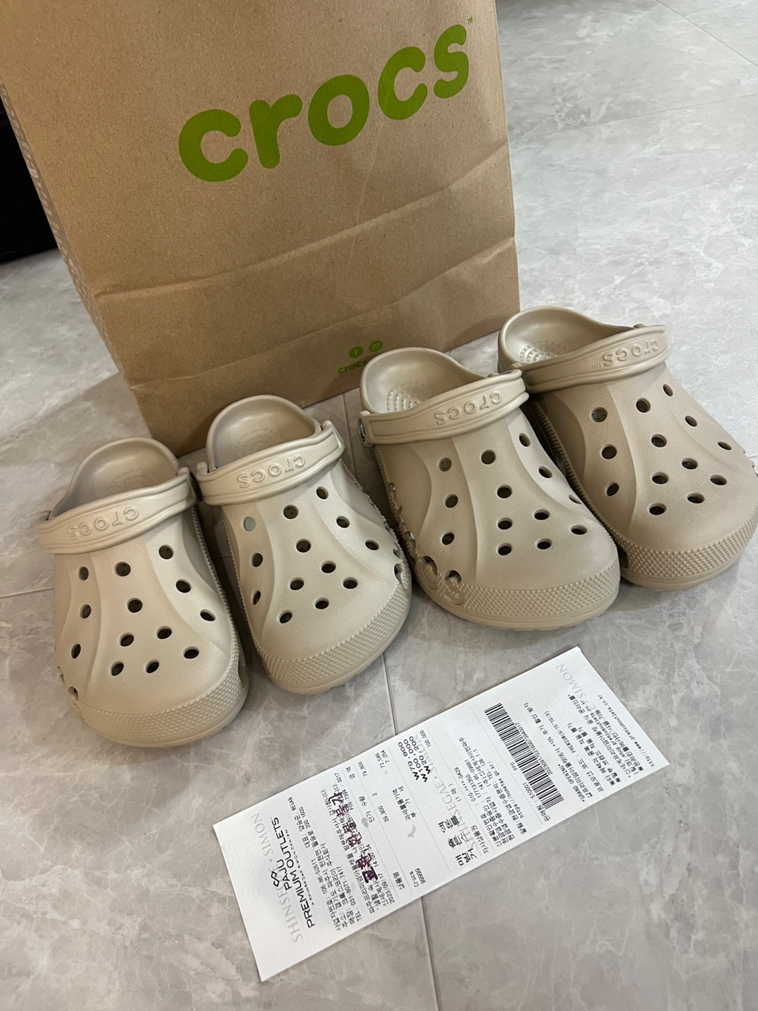 크록스 공식 홈페이지 – 바야 클로그 크록스… 솔직히 못생기고 저런 신발을 왜 신지? 싶었던 사람 손! 지비츠? 유치하게 그런 걸 왜 붙이고 다니나 했던 사람 손! 🤚저요 저요!! 네, 제가 그랬었는데요. 다 늦은 여름에 샀습니다. 크록스. 크록스 바야 클로그 구매 후기 10월 초 발리로 태교 여행을 계획하고 있다. 원래 내 여름 공식 샌들은 테바 보야 인피니티였는데 너무 낡아서 버리고 새로 살까 말까 고민하고 있었던 참이었고, 남편은 주로 운동화를 신고 너무 더울 땐 쪼리를 신는 편인데 최근에 새로 산 쪼리가 발에 안 맞아 고통을 호소하고 있었다. 아무래도 출국 전에 샌들을 하나 사긴 해야겠다고 생각하던 참. 원래는 겨울 코트를 보러 파주 프리미엄 아웃렛에 갔는데 어쩌다 보니 크록스 매장에 들어갔다. (다들 이렇게 쇼핑하시죠..?) 그때 까지도 솔직히 살 생각은 없었는데, 신어보니 핏이 생각보다 귀엽잖아..? 남편까지 신겨놓고 보니 커플 신발로 하나 장만하고 싶어 져서 급 구매하게 되었다. 추석이라 그런지 세일 혜택도 있어서 가격까지 굳굳! 크록스 구매 모델 / 컬러 / 사이즈 📍크록스 바야 클로그 📍컬러 : 코블 스톤 📍사이즈 : 여자 발볼 좁은 235 – 크록스 240사이즈 W7 / 남자 발볼 넓은 260 – 크록스 265사이즈 M8 크록스 바야 클로그 코블스톤 우리가 고른 모델은 크록스 바야 클로그이다. 처음 매장에 갔을때 플랫폼이 있는 모델이 눈에 띄어서 클래식 플랫폼 라인드 클로그 모델과 고민을 좀 했었는데 아무래도 굽이 낮은 바야 클로그 모델이 더 신고 다니기 좋을 것 같아서 + 가격도 더 저렴하길래 크록스 바야 클로그로 골랐다. 실제로 착화감도 바야가 더 편한 것 같다. 크록스 바야 클로그 사이즈는 반사이즈 업 크록스는 대체로 발볼이나 발높이가 넉넉하게 나오긴 하지만 기존에 신던 운동화 사이즈에서 반사이즈 정도 크게 사는 것이 좋다. 정사이즈 그대로 신으면 나중에 다닐 때 굉장히 불편하다고 한다. (플랫폼이 있는 모델은 바야 모델보다 발볼이나 발 높이가 좁게 나온다고 한다. 플랫폼이 있는 모델을 살 경우 한 사이즈 이상 크게 사는 것을 추천드린다.) 직원분이 팁을 주셨는데 신발을 신었을때 발가락이 앞에 닿으면 안된다고 한다. 발가락이 앞에 닿도록 쑥 밀어넣고 쟀을때 뒷 부분이 손가락 한마디정도 (1.5센티) 여유가 남는게 좋다고! 컬러는 코블스톤 컬러로 골랐는데, 다양한 컬러의 옷과 매칭해도 괜찮을 것 같았고, 화이트보다는 때도 덜 탈 것 같았다. 무엇보다 실제로 신었을 때 매우 귀엽게 느껴져서 코블스톤 컬러 당첨. 크록스 바야 클로그 구매 가격 크록스 구매 영수증크 파주 프리미엄 아웃렛에서 현재 세일을 진행하고 있는데, 2켤레를 구매하면 총금액의 20%를 할인해 준다. 총 구매 금액은 두켤레 합쳐서 79,800원! 한 켤레당 39,900원으로 저렴하게 잘 산 것 같다. 크록스 바야 클로그 착화감 일단 엄청 가볍고 푹신하다. 하지만 구매하고 하루 출퇴근길에 맨발로 신어봤는데 (도보 시간 총 약 30분) 오른쪽 발가락 끝 부분과 왼쪽 발 안쪽 복숭아뼈가 살짝 아팠다. 발가락 끝 부분은 좀 더 오래 걸으면 물집이 잡힐 것 같았고, 왼쪽 발 안쪽 복숭아뼈도 (내가 유난히 튀어나옴) 계속 밴드 부분과 마찰이 생겨서 빨갛게 되었다. 그래도 다행히 30분 정도 걷는 걸로는 실제 물집이 잡히거나 상처로 이어지진 않았음. 그것 외에는 착용감은 편하다. 통풍도 잘되고. 아무래도 처음 신을 때는 약간의 적응 기간이 필요해 보인다. 다음번에는 양말을 신고 신어봐야겠다. 유치하다고 생각했던 지비츠도 구매했다. 아직 배송 중… 오면 얼른 끼워보고 추가로 포스팅하겠다. 🤣