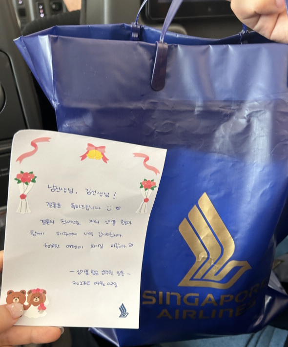 여러분 안녕하세요~~! 저는 작년 9월초!! 발리로 신혼여행을 다녀왔는데요? 파워J인 저는.. 출발 전부터 이것 저것 알아보다가 제가 이용하는 싱가포르 항공사에 허니문 케이크를 신청해서 받을수 있다는 정보를 얻고!! 바로 신청!!! (싱가포르 경유 발리행!!) 여러분도 혹시 신혼여행으로 발리 가실때 싱가포르 항공사를 이용하신다면!! 참고해주세요~~! 반응형 싱가포르 항공사에 허니문 케이크 신청하는 방법 싱가포르 항공사 한국지사에 이메일을 보내서 미리 신청해야합니다!! 주소: Kr_reservations@singaporeair.com.sg 내용: 항공편 날짜, 편명 정보, 어느 구간에서 받을지, 예약자 이름, 예약 번호 기입 한국지사라서 한글로 내용을 작성해서 보내셔도 괜찮아요!! 후기 발리행 비행기 한국에서 싱가포르로 가는 구간에서 기내식을 먹고 허니문 케이크를 기다렸어요~~ 사실 너무 배부르기도 했고.. 승무원분께서 포장해가시겠냐고 물어보시길래 잽싸게 그러겠다고~~!! 대답!!! 싱가포르항공사 허니문케이크 포장 저렇게 포장해주시고 손편지까지 써주셨다… 너무 감동..이게 무료라니..!!!!!!! 너무 감사드려요~~! 안에 파우치도 하나 들어있더라구요!!! 가는날부터 기분이 아주 좋았어요! 허니문 케이크 모습 싱가포르 경유지에서 꺼내본 허니문 케이크~~! 맛은 사실 별로 였어요..ㅜㅜ 그래도 신혼여행때 기념으로 받은만큼 너무나 의미가 있었던 케이크!! 훌륭합니다! 포장 안하고 비행기에서 먹으면 샴페인도 주시는거 같았어요!! (그거 안먹은건 살짝 아쉽다..) 제 경험이 도움되시길 바래봅니다~~!