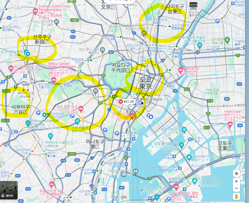 – 도쿄에서 놀러 갈 만한 곳을 노란색으로 표기함 – 좌측부터 시부야 – 신주쿠 – 오모테산도 – 히비야 / 긴자 – 도쿄역 부근 – 우에노 지역 지역 특성 – 시부야: 시부야 스카이 전망대 및 각종 맛집 – 신주쿠: 쇼핑하기 좋은 곳. 일본의 명동. 이세탄 맨즈 등 – 오모테산도: 청담거리. 일본 명품 스토어 다수 – 히비야: 일본 직장인들의 거리. 여기도 음식점 다수 존재 – 긴자: 츠키치 시장도 있고, 여기도 명품거리 및 백화점 존재. 맛집도 다수 존재 – 도쿄역: 이동하기 좋음. 서울역과 같은 존재. 동경역 부근을 개발하여 서울역과 다르게 깔끔함 – 우에노: 가성비 맛집 존재. 미술관 존재 숙소 특징 – 머큐어 히비야: 23년 12월 영업개시. 기존 오피스 건물의 하부 (1-12층)를 호텔로 개조. – 숙소의 방향은 두가지. 히비야 공원 방향과 앞에 전철 방향 (긴자 방향). – 전철 방향은 탁 트여있음. 하단부는 약간의 소음이 존재할 것으로 예상. 히비야 공원 방향도 지금은 트여있으나 나중엔 막힐 것으로 예상 (앞에 건물 공사 중) – 조식은 약간의 뷔페메뉴 + 알라카르테 메뉴 제공. 조식의 가지수는 많지 않으나 퀄리티가 괜찮 – 방은 좁은 편. 바닥에 캐리어 2개는 펼칠 수 있었음 – 주변 전철역이 가까움. 신바시 역을 통과하는 라인이 다수. 신바시역까지 도보로 5-7분 – 웬만한 지역을 전철로 30분 이내로 접근 – 숙소 바로 주변에는 관광지가 없음. 그 대신 조용함 – 옆에 있는 다이이치 호텔(제일호텔)이 더 유명한 듯. 다이이치 호텔을 통과하는 공항 리무진 버스 있음 (1시간 30분 소요) – 이전에도 말했듯이 도쿄 호텔이 많이 비싸졌음. 난 아코르 멤버십이 있어서 free night 사용 – 헬스장 있으나 작음. 덤벨은 다수 보유 – 라운지가 생각보다 넓고 잘되어 있음 – 룸타입은 프리빌리지룸 킹사이즈 베드였음