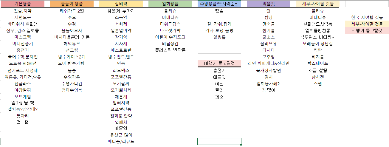 세부 한달 살이 드림하우스 준비물 이번에 처음으로 아이 셋과 세부에서 한 달 동안 지내게 되었어요. 치안이 걱정이기도 했고 아이 셋을 혼자 케어해야 한다는 부담도 있었지만 좋은 기회로 저렴하게 3주 에듀수업과 4주 숙소가 해결되는 곳으로 예약했지요~ 저희는 지인이 알려주어서 세부 플레이드림에듀라인으로 수업받고 드림하우스에서 머물기로 했답니다. 클릭하면 네이버 카페로 연결 비수기 얼리버드 할인가격으로 많이 저렴하게 예약했어요^^ 영어도 어학원이 아니라 1:1 놀이식으로 진행되는곳이예요 한국에서도 학원다니느라 힘든데… 이번 한달은 놀자 하고 가는거라 플레이드림 에듀로 예약 지금까지는 안내 해주시는 분들이 친절해서 만족해요 영어야~ 아이마다 다를테니깐 후기는 다녀와서 다시 남겨볼게요 저는 여행할 때 되도록 준비물을 일단 적어놓고 챙기는 편이에요 여행마다 비슷해도 아이가 셋이라 챙기면서 빠지는 것들이 꼭 있더라고요 리스트 정리 하면서 검색도 하고 후기들도 보면서 그 여행지에 그 숙소에 필요한 것들을 적어놔요 파일 공유해 두었으니 필요하신 분은 다운로드하여서 쓰세요 행복한 여행준비에 도움이 되길 바라며 우리 삼 남매도 여행준비 열심히 해볼게요~ 세부 드하 2024년 6월여행준비물.xlsx 0.01MB