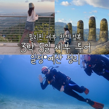 세부 여행 3박 5일 경비 예산 비용•일정 후기 (호핑투어•체험다이빙 •어메이징 쇼•마사지) 글•사진 에이데이 안녕하세요, 여행 인플루언서 에이데이입니다. 가족여행으로도 친구들과 우정여행으로도 좋은 곳이 필리핀 세부인 것 같아요. 물놀이, 마사지, 시티 투어, 쇼핑 등등에 저렴한 물가, 좋은 리조트! 모두가 만족할 수 있는 여행지는 세부인 것 같아요. 제각기 다른 네 명이 함께 다녀온 3박 5일 필리핀 세부 일정, 경비, 예산, 비용 후기 적어볼게요. 🔵세부 여행 3박 5일 일정 시 간 1일차 2일차 3일차 4일차 5일차 오전 체험다이빙 자유 시간 체크아웃 한국 도착 오후 마사지 저녁 식사 단독 호핑 투어 점심 식사 날루수안 힐룽뚱안 점심 식사 시티투어 아얄라 몰 쇼핑 시라오 플라워 가든 탑스 힐 저녁 어메이징 쇼 관람 마사지 저녁식사 마사지 밤 세부 도착 공항 픽업 자유 시간 자유 시간 11시 공항 🚩DAY 1 밤 9시 45분 비행기로, 휴가 하루를 아낄 수 있는 일정으로 세부로 떠났다. 비행기에서 푹 자고 새벽 1시-2시쯤 도착해서 정신없지만 공항에서 나오자마자 BOB 투어 가이드가 마중 나와 있었다. 그래서 바로 숙소로 이동! 숙소로 이동하면서 마트에 들러 먹을 것도 이것저것 구입해서 리조트에 도착. 짐을 풀고 1일차 일정 종료! 🚩DAY 2 📍 체험 다이빙 (퍼플오션) 한국인 전문 다이빙 강사 크리스와 함께 이론 교육, 장비 교육도 하고 수영장 교육도 한 후 바다로 나가게 된다. 날씨가 너무 좋아서 매우 신났던 체험 다이빙하는 날. 귀여운 후드들이 햇빛에 잘 건조되는 중. 마스크 착용 법 설명해 주시는 중. 간단한 수신호들과 안전 수칙에 대해서 설명해 주셨다. 다이빙 슈트를 입고 수영장으로! BOB 투어에서 체험다이빙을 배우는 곳은 막탄 유일 최대 수심 4m의 풀장에서 적응 연습을 할 수 있다는 것이 장점. 한국에서도 3m에서 연습을 했는데 말이야. 하트하트 ❣️ 수영장 적응 훈련 후, 바다로 이동. 체험 다이빙은 앞 바다에서 진행되는데 배를 타지 않아도 돼서 뱃멀미 걱정이 없다는 것이 좋았다. 앞바다라고 하지만 바다는 정말 넓고 많은 것들이 있구나 생각이 들었다. 그 사진들은 아래에 더 나옵니다!! 우리의 마스터들이 무거운 다이빙 장비를 옮겨주셔서 우리는 가볍게 이동 가능해서 좋았다. 귀여운 아네모네 피시(니모)와 사진 찍기. 세부 앞바다에 나가면 가장 흔하게 볼 수 있는 물고기 중에 하나이다. 말미잘 속에 숨어 산다는데 정~말 귀엽다. 수중 전문 카메라로 찍어 주신 사진! 체험 다이빙 투어에는 사진 촬영까지 포함되어 있어서 인생 사진을 남길 수 있다! 세부 앞바다에 이런 곳이!!! 마치 <인디아나 존스> 그런 영화에 나오는 것처럼 무언가 탐사를 떠나는 느낌이었다. 현실은 오리 머리 후드를 쓰고 세부 앞바다 탐험 중. 안녕하세요. 오리입니다. 🐥 확실히 플래시까지 있는 전문 장비라 사진이 다르다!! 세부 체험다이빙에서 물고기 밥 주기. 예전에는 물고기가 무섭기도 했는데 이제는 귀엽기만 하다. 📍 오아시스 스파 마사지 체험 다이빙 후에는 세부에서 받아 본 마사지 중에 손꼽히는 오아시스 스파에서 마사지를 받았다. 오아시스 스파의 웰컴 티는 망고티였다. 오아시스 스파는 시설이 깨끗하고 깔끔해서 다이빙이나 호핑투어를 마치고 샤워하면 딱 좋다. 사실 호텔 수압 보다 오아시스 스파의 수압이 더 좋아서 이곳에서 샤워할 수 있어서 좋았다. 마사지는 늘 테라피스트에 따라 너무 다르고, 마사지 받는 사람 스타일도 다 다르지만 나는 압이 세고 근육을 한 가닥 한 가닥 부셔주는 마사지를 좋아하는데 만족스러웠다. 📍 어메이징 쇼 마사지도 받고 저녁 식사까지 먹고 우리는 어메이징 쇼를 관람했다. 어린이부터 어른들까지 재미있게 관람할 수 있는 어메이징 쇼. 필리핀 사람들이 춤과 노래를 좋아하고 잘한다는데 다들 춤을 정말 잘 추고 끼가 넘쳤다. 중간에 관객 참여 퍼포먼스가 있는데 두 번 거절에 무대로 끌려나가기도… 비욘세 저리 가라의 언니… 아니 오빠..! 🚩DAY 3 📍 단독 호핑투어 20인승의 방카에서 우리 팀만 즐기는 단독 호핑투어. 우리 팀만 즐기는 단독 호핑투어라 시간제한 없이 원하는 만큼 스노쿨링을 할 수 있다는 것이 좋았다. 날루수안과 힐룽뚱안 바닷속은 영화 <아바타 물의 길>을 연상시켜서 마치 영화 속에 들어와 있는 느낌을 주기도 한다. 그래서 얼마나 프리다이빙을 연습했는지..! 🤣 고프로로 사진 촬영까지 포함되어 있어서 따로 수중 카메라를 준비하지 않아도 된다는 것도 너무 좋았다. 열심히 수영하고 선상에서의 점심 식사. 따뜻한 국물(미역국)까지 준비된 든든한 점심 식사였다. 호핑도 하고 손낚시 체험도 하고, 몰랐던 낚시의 ‘손맛’이라는 것을 조금 알게 되었다. 물고기가 미끼를 물었을 때 탕탕 당겨지는 낚싯줄!! 세부에서 3일 차도 맛있는 저녁 식사 후 마사지까지 받고 리조트로 귀가! 🚩DAY 4 벌써 아쉽게도 세부에서 마지막 날이다. 마지막 날이라 느긋하게 체크아웃 시간까지 리조트를 즐기고 짐을 정리해서 나왔다. 오늘 하루 전용 차로 이동하기 때문에 짐 걱정은 없다. 시티투어는 차량 이동 시간이 긴 편이라 편안한 승차감+