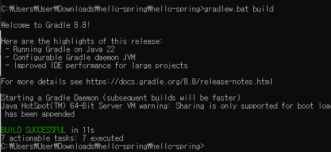 hello-spring 폴더로 이동 > gradlew.bat build 그럼 성공 메시지가 뜬다. 이제 \build\libs에 이동하여 java -jar hello-spring-0.0.1-SNAPSHOT.jar를 입력하면 빌드가 완료된다. localhost:8080에서 볼 수 있으면 성공이다. 참고 https://velog.io/@snowball9820/Spring-cmd%EC%97%90%EC%84%9C-%EB%B9%8C%EB%93%9C%ED%95%98%EA%B3%A0-%EC%8B%A4%ED%96%89%ED%95%98%EA%B8%B0%EC%9C%88%EB%8F%84%EC%9A%B0-%EA%B8%B0%EC%A4%80 김영한 강사님의 ‘스프링 입문 – 코드로 배우는 스프링 부트, 웹 MVC, DB 접근 기술’을 듣고 정리한 것입니다.