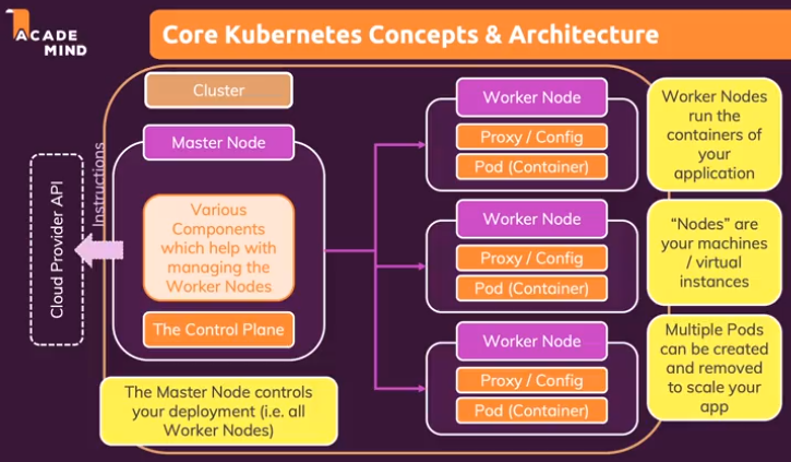 Kubenetes는, 프로그램(애플리케이션)을 Container 로 배포, 확장 및 관리할 때 사용하는 시스템 Docker Container 를 배포하고 orchestration 하는 표준 시스템임 Kube 는 여러 머신을 위한 docker-compose 라고 생각할 수 있음 docker-compose 는 하나의 머신 위에 여러 Container 를 띄우고 관리하고 Kube 는 더 나아가 여러 머신 위에 여러 Container 를 띄우고 모두 관리(배포, 모니터링 등)함 Kube 없이 수동으로 Container 를 배포하면, Container 가 떠야 할 서버를 직접 구성 및 관리해야하며 Container 관리, 즉 보안, 구성, Container 간 충돌, Container down 등의 이슈도 직접 처리해야 함 Container down 이 발생 할 때마다 직접 모니터링하고 이슈를 해결하고 수동으로 재배포해줘야 하는 번거로움이 있음 (근데 이건 Kube 써도 마찬가지 아닌가) Container 로 들어오는 트래픽이 양이 변할 때 Container Scaling 을 수동으로 처리해야 하며 트래픽을 모든 Container 에 고르게 분산시키기 위해 추가 작업을 해야 함 Kube 를 사용하면 자동 배포, Scaling, 로드 밸런싱, Container 관리 등을 손쉽게 할 수 있음 Kube 는 (EC2 처럼 CPU, RAM 이 장착된 Physical/Virtual 머신인) 하나 이상의 Worker Nodes 로 이루어져 있으며 Worker Nodes 는 (실제 Container 와 동일한) 하나 이상의 Pods (=Containers) 와 (Pods 의 네트워크 트래픽 제어를 위한) Proxy/Config 로 이루어져 있음 Prox/Config 는 Pods 가 외부 인터넷에 연결 가능한지 여부와 외부 인터넷에서 (Pods 내부에서 실행되는) Container 로 어떻게 접근할 수 있는지를 제어함 Kube 를 사용하여 Container 및 Pod 를 동적으로 추가/제거하는 경우 Kube 가 사용 가능한 Worker nodes 에 Pods 가 자동으로 배포됨 따라서 서로 다른 여러 Worker Nodes 위에서, 여러 Containers 를 실행하여 워크로드를 고르게 분배 가능함 Worker Nodes 에 Pods 를 새로 띄우거나, (실패하거나 필요하지 않은 경우) Pods 를 교체하거나 종료하는 역할은 Master Node 에 의해 진행됨 Master Node 는 Worker Nodes 처럼 하나의 머신임 Master Node 위에서 실행되는 Control Plane 이 위 작업을 수행하게 됨 Control Plane 은 Master Node 에서 실행되는 다양한 서비스의 다양한 도구 모음이며, Worker Nodes 를 제어하는 컨트롤 센터같은 거라고 생각하자. 우리가 Kube 를 사용할 때, Worker Nodes, Pods 와 직접 상호작용하지 않음(일반적으로 하지 않음) Kube 와 Control Plane 이 우리 대신 Worker Nodes, Pods 와 상호작용 함 Master Node 와 Worker Nodes 가 하나의 Cluster 안에 포함되며 Cluster 내 Nodes 들은 하나의 네트워크를 형성하여 서로 통신이 가능함 EC2 위에 띄운 Master Node 는 Cloud Provider(예를 들어 AWS) 의 API 에 다음과 같은 명령을 보내 Cluster 를 구축함 “내가 지금부터 너의 서비스들을 이용하여 Kube 를 실행할 Cluster 를 만들꺼야. Worker Nodes 만들 EC2 3대를 생성하고, 로드 밸런싱을 위한 로드 밸런서, … 등을 실행해 줘” 그리고 Master Node 에서 Kube 와 Kube 툴을 실행하고 AWS 로부터 받은 리소스(EC2, 로드 밸런서 등)를 이용하여 Pods 를 띄우는 등의 작업을 진행함 Kube 사용자가 (Cloud Provider 도움 없이) Kube 를 사용하기 위해 해야 할 일들이 있음 Kube 는 infrastructure 에 대해 전혀 신경쓰지 않기 때문에 사용자가 infra 를 미리 구축해주어야 함 Nodes 로 사용될 머신들 (AWS 의 경우 EC2) 을 준비해야하며 준비된 모든 Nodes 에 Kube (API Server, kubelet 등의 Kube services, softwares) 를 설치해야 함 필요하다면, cloud provider 로부터 얻을 수 있는 로드 밸런서 등의 리소스를 미리 준비 사용자가 위와 같은 infra 리소스들(Nodes, 로드 밸런서 등)을 준비해두면 Kube 는 이 리소스들을 알아서 운용함 Worker Node 에 대해 자세히 알아보자. Worker Node 는 (위에서 설명한 것처럼) 하나의 머신이며 Master Node 에 의해 관리됨 Worker Node 안에서 하나 이상의 Pods 가 있고 이 Pods 또한 Master Node 에 의해 관리됨 (따라서 Worker Node 가 Pod 를 삭제할 수 없음) Worker Node 에 꼭 설치되어 있어야하는 것들은 다음과 같음 – Docker : Pods 내 Container 실행에 사용됨 – kubelet : Master Node 와 통신할 때 사용됨 – kube-proxy : (Pods 내 Container 에 의해) 해당 node 로 들어오고 나가는 네트워크 트래픽을 처리할 때 사용됨 AWS 를 사용하는 경우, 위에서 언급한 필요한 머신(instance) 및 소프트웨어들을 AWS 가 알아서 설치해준다고 함 Pods 는 하나 이상의 Containers 를 실행하고 있음 일반적으로 pod 하나에 Container 하나 실행 Pods 는 Container 외에 Volumes 같은 리소스도 실행 가능(..!) 이 Volume 은 Container 가 사용 가능한 저장소임 Pods 는 Containers(와 Volumes) 를 묶는 논리적인 단위 같은 거라고 이해하면 편할 듯 kubelet 은 Worker Node 에 존재하며, 다음과 같이 노드 및 파드 운영에 큰 역할을 담당하고 있음 – 파드 관리 : Master Node 로부터 할당된 파드를 Worker Node 에 배치하고 실행 파드 상태 주기적으로 모니터링하고 문제 발생시 다시 시작 – 컨테이너 실행 : 파드에 정의된 Container 를 실행하고 관리 Container 시작/중지 및 리소스 할당 – 리소스 모니터링 및 보고 : Worker Node 의 리소스 사용량 모니터링하여 클러스터 상태 파악 모니터링 정보는 Master 에 보고되고, 클러스터 스케줄링할 때 사용됨 – 상태 모니터링 및 보고 : Worker Node 및 파드 상태를 Master 에 보고함 이를 통해 Master 는 전체 클러스터 상