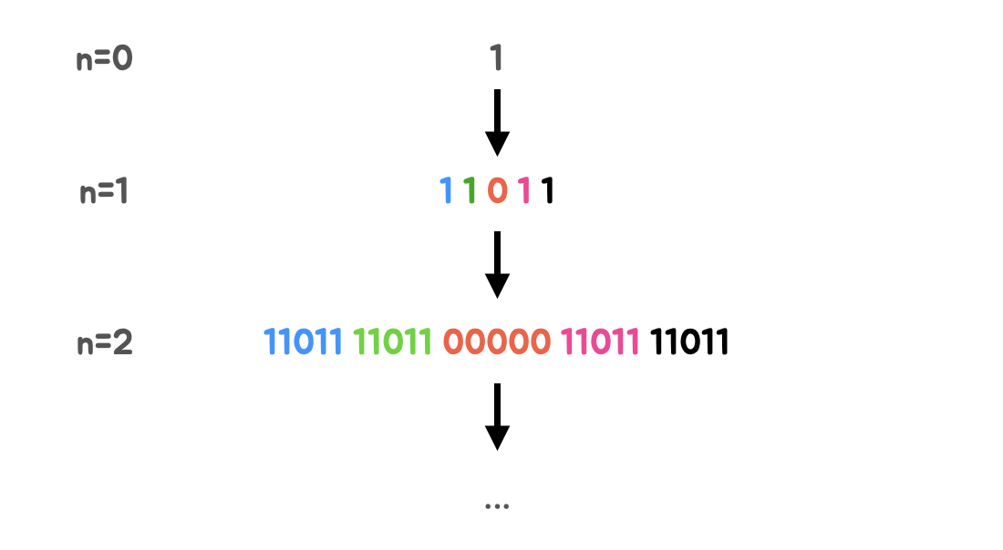 for(int i = L-1; i < R; i++) { if (s[i] == '1') cnt++; } return cnt; } void makeCantor(int n, int cur, string s) { // 재귀 탈출 if (cur == n) { ret = countOne(s); return; } string ns = ""; for (int i = 0; i < s.length(); i++) { if (s[i] == '1') ns += "11011"; else ns += "00000"; } makeCantor(n, cur + 1, ns); } int solution(int n, ll l, ll r) { L = l; R = r; makeCantor(n, 0, "1"); return ret; } 하지만 시간 초과가 발생하였다! 정확히 연산 양을 계산하진 않았지만 제한사항이 매우 크고 재귀까지 했으니 시간 초과 날 만두 ... 3. 구현 아이디어2 - 정답입니다! 재귀를 좀 더 효율적으로 해야 할 것 같아 유사 칸토어 비트열의 규칙을 찾아보았다. K번째 유사 칸토어 비트열의 길이 = 5^k K번째 유사 칸토어 비트열을 5등분하면 3번째 구간은 무조건 0으로만 구성되어있음 위 규칙을 사용하여 l과 r이 5등분했을 때 어느 구간에 속하는지 계산하면 되지 않을까?했는데 경우의 수가 많고 복잡한 것 같아 다른 사람의 풀이를 참고하였다. 일반적인 풀이는 내가 떠올린 것과 비슷하게 수학적인 규칙을 찾고 분할 정복 알고리즘을 문제를 푸는 것이다. 하지만 더 똑똑하고 쉬운 풀이 방법을 찾아 해당 방법을 참고하여 문제를 풀었다! 🌟 K번째 유사 칸토어 비트열에서 해당 위치가 0인 인덱스를 찾아보자 1 → [] 11011 → [2] 1101111011000001101111011 → [2, 7, 10, 11, 12, 13, 14, 17, 22] … 이제 위에서 찾았던 인덱스를 5진수로 바꿔보자 [] [002] [002, 012, 020, 021, 022, 023, 024, 032, 042] [0002, 0012, 0020, 0021, 0022, 0023, 0024, 0032, 0042, 0120, 0121 ...] 여기서 규칙을 찾아보면 5진수로 표혔했을 때 하나라도 2가 포함되어 있으면 해당 인덱스의 값은 0이라는 것을 알 수 있다. 이것을 10진수 관점으로 말하면 인덱스 i가 5로 나눌 수 없을 때까지 계속 나눴을 때 한 번이라도 나머지가 2가 나오면 해당 인덱스 값은 0이라는 것과 동일하다. 이진수 계산법 왜냐하면 위 이진수 계산법 사진처럼 n진수는 10진수를 n으로 나눴을 때 나머지를 나열한 것이 되기 때문이다. using namespace std; typedef long long ll; // 인덱스 x를 5로 나눌 수 없을 때까지 계속 나누면서 나머지가 2가 나오는지 확인 bool isOne(ll x) { while (x >= 5) {